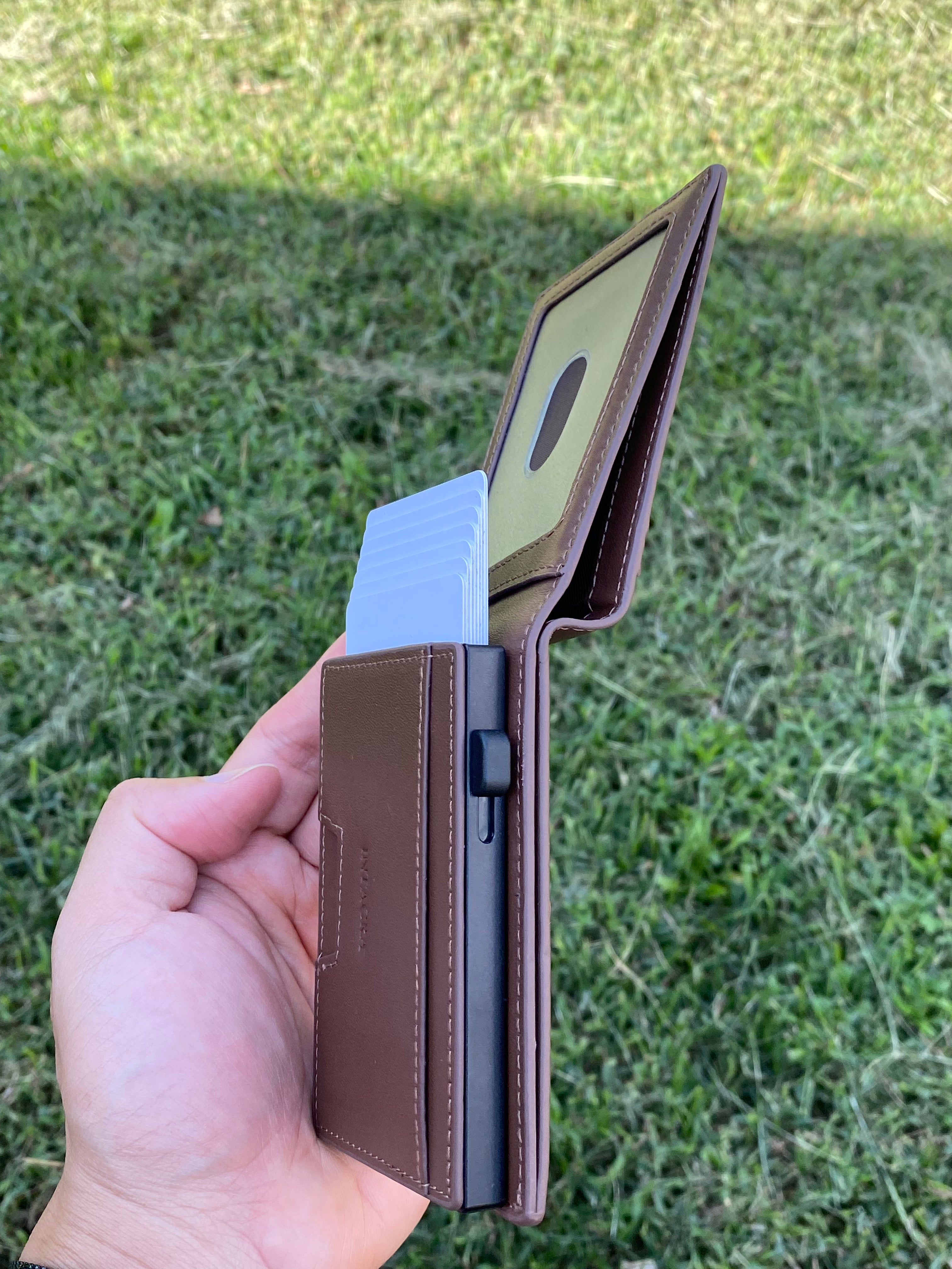 Discover the perfect solution for organizing your cards with our aluminum card holder. Effortlessly slide down the button to conveniently pop up your cards.